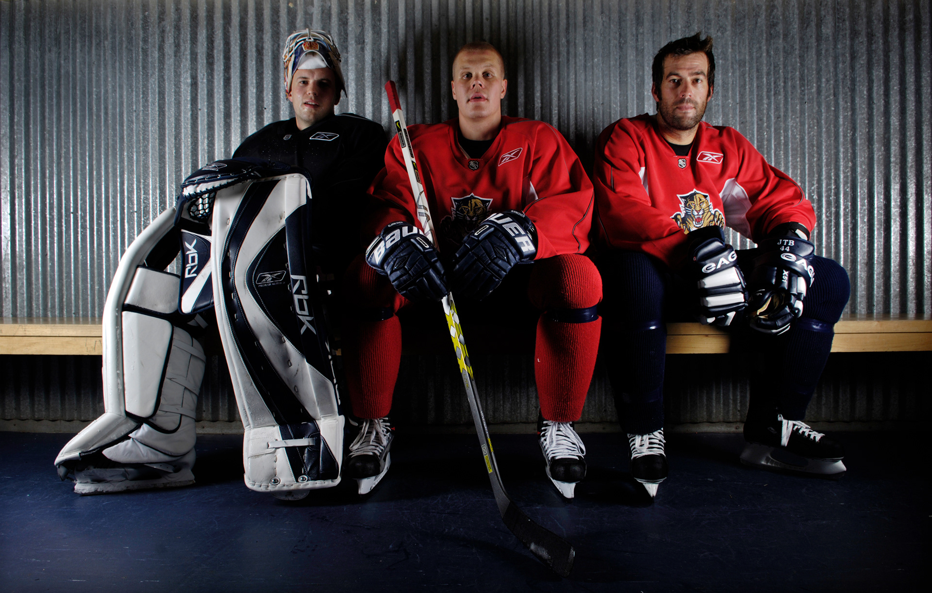 Florida Panthers players wait their turn to hit the ice during the team's first practice of the 2002 season.